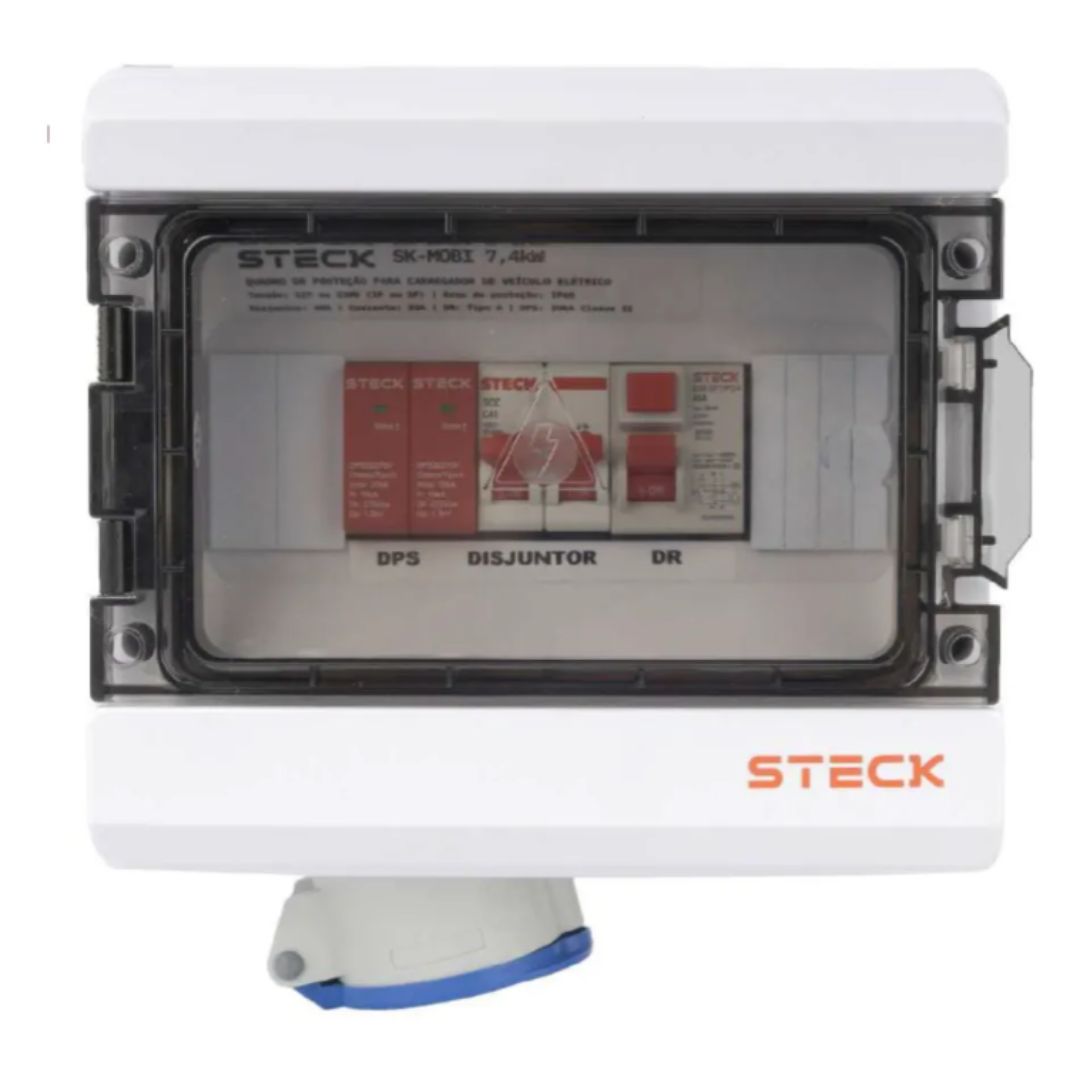 Conta com tomada industrial Steck SK-Mobit N 3246 (32A), garantindo uma conexão firme e segura para o carregamento do seu veículo elétrico.